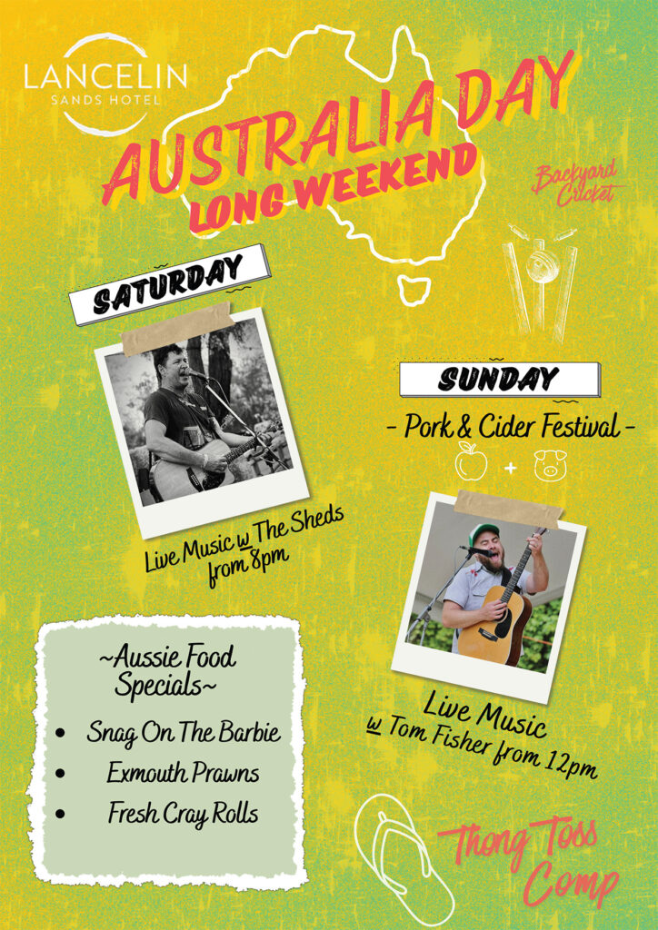 🔥 SUNDAY – Pork & Cider FestivalLive Music with Tom Fisher from 12pmAussie Food Specials all day:🌭 Snag on the Barbie🦐 Exmouth Prawns🦞 Fresh Cray Rolls
